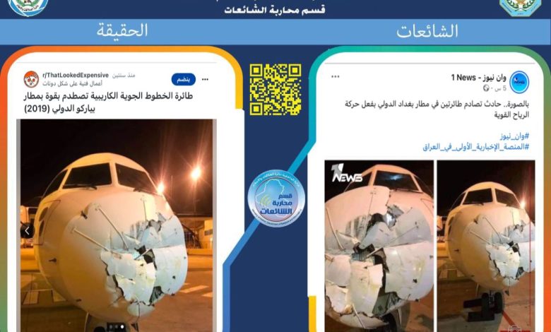 انتشرت على مواقع التواصل الاجتماعي اخبار ملفقة مفادها تصادم طائرتين في مطار بغداد الدولي بفعل حركة الرياح القوية .