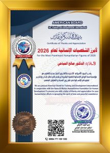 في لفتة تقديرية تعكس أهمية العمل الإنساني والإعلامي المشترك قدم البورد الأمريكي للتدريب والتطوير الدولي، بالتعاون مع مؤسسة الأمن الوطني الإنسانية للتنمية البشرية، خطاب شكر وتقدير إلى الدكتور صالح المياحي رئيس الاتحاد العربي للإعلام الإلكتروني